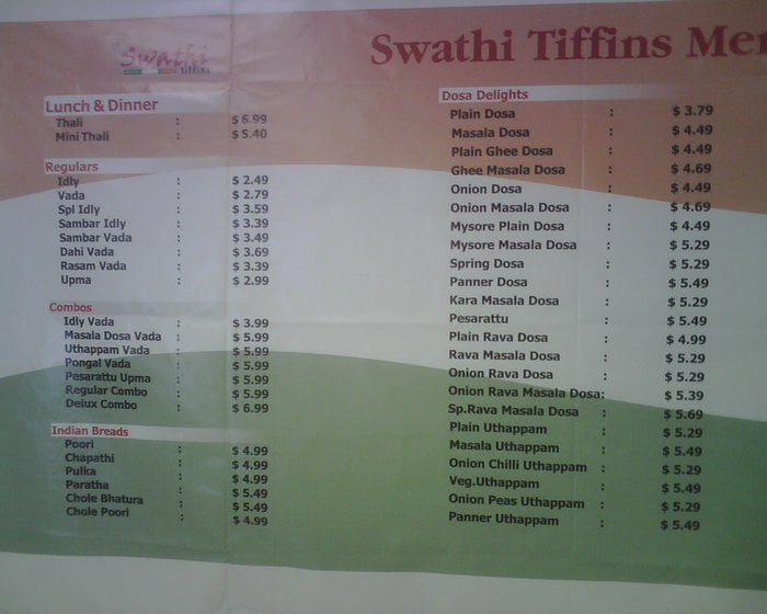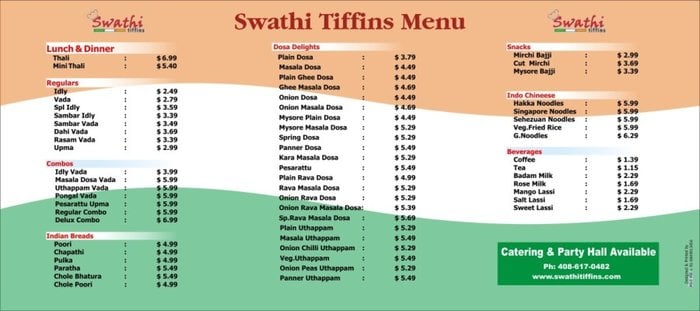 Swathi Tiffins is a South Indian restaurant located in Sunnyvale, CA. Offering a variety of tiffin options, they provide a unique dining experience for both vegetarians and vegans. The restaurant features a casual atmosphere with options for outdoor seating and free Wi-Fi. Known for their Deluxe combo, rava dosa, and Paneer biryani, customers rave about the authenticity and taste of the dishes. With favorable reviews highlighting the Masala dosa, upma, and Mysore bonda, Swathi Tiffins is a must-visit for those craving traditional South Indian cuisine. Whether you're looking for a quick takeout or a leisurely dine-in experience, Swathi Tiffins caters to all preferences. Don't miss out on their Happy Hour specials and wide array of dosa options – a true delight for tiffin lovers!